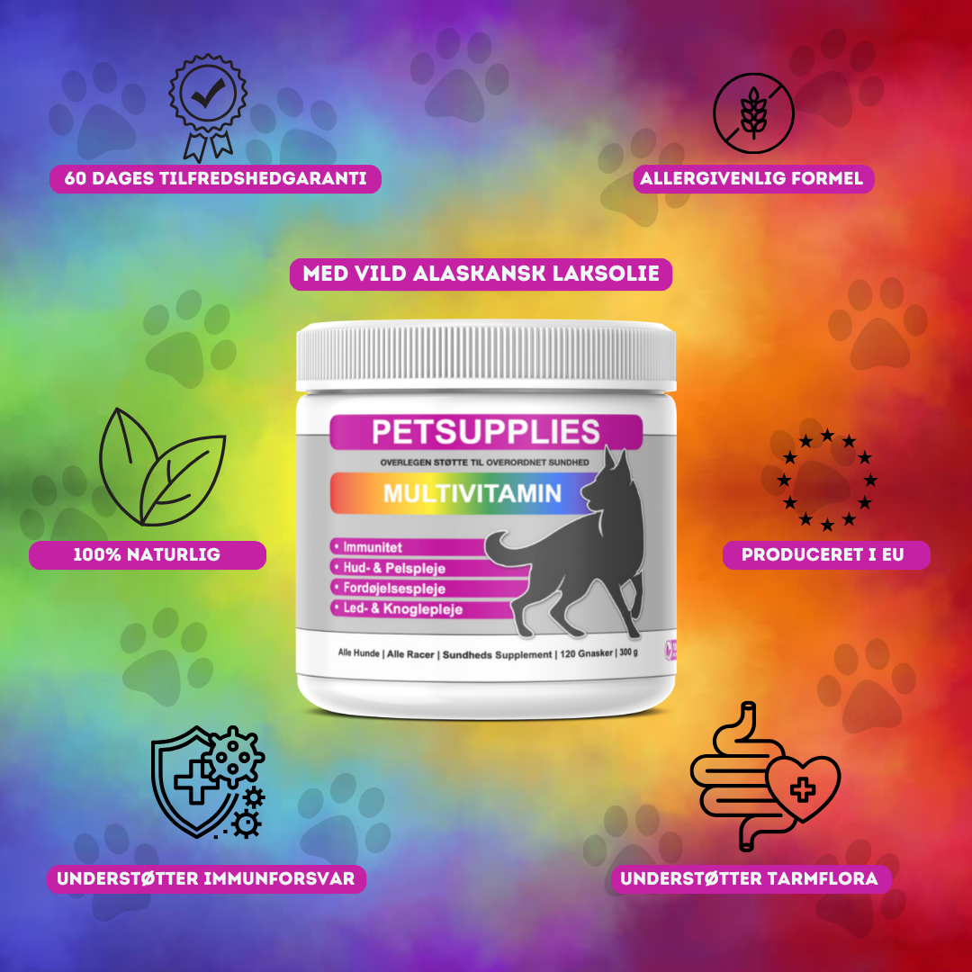 Forbedret tarmhelse er essentiel for et stærkt immunsystem, og denne multivitamin hjælper med at opretholde fordøjelsessystemets integritet. Et sundere tarmmiljø understøtter immunsystemet ved at hjælpe med at forhindre skadelige patogener i at påvirke din hunds helbred, hvilket gør dem bedre rustet til at bekæmpe infektioner.