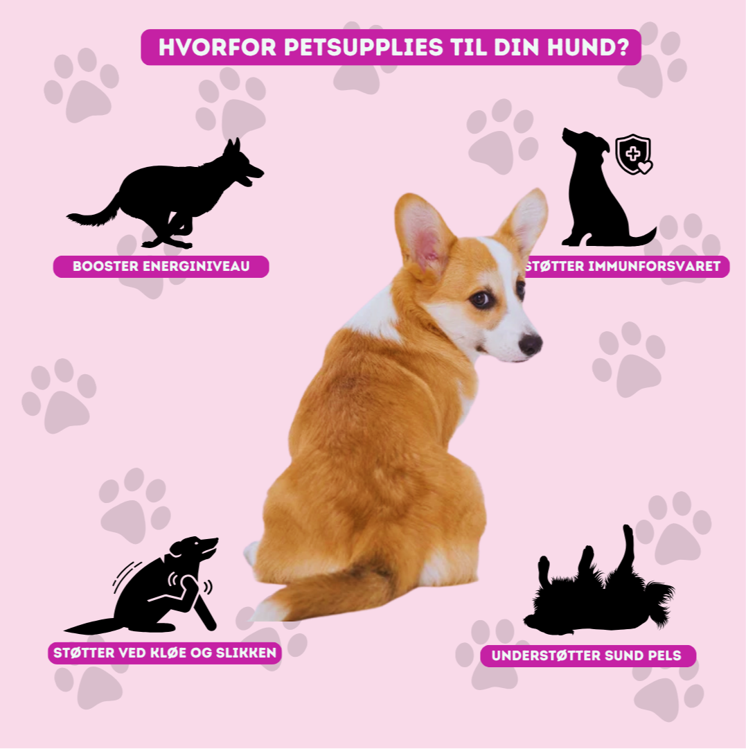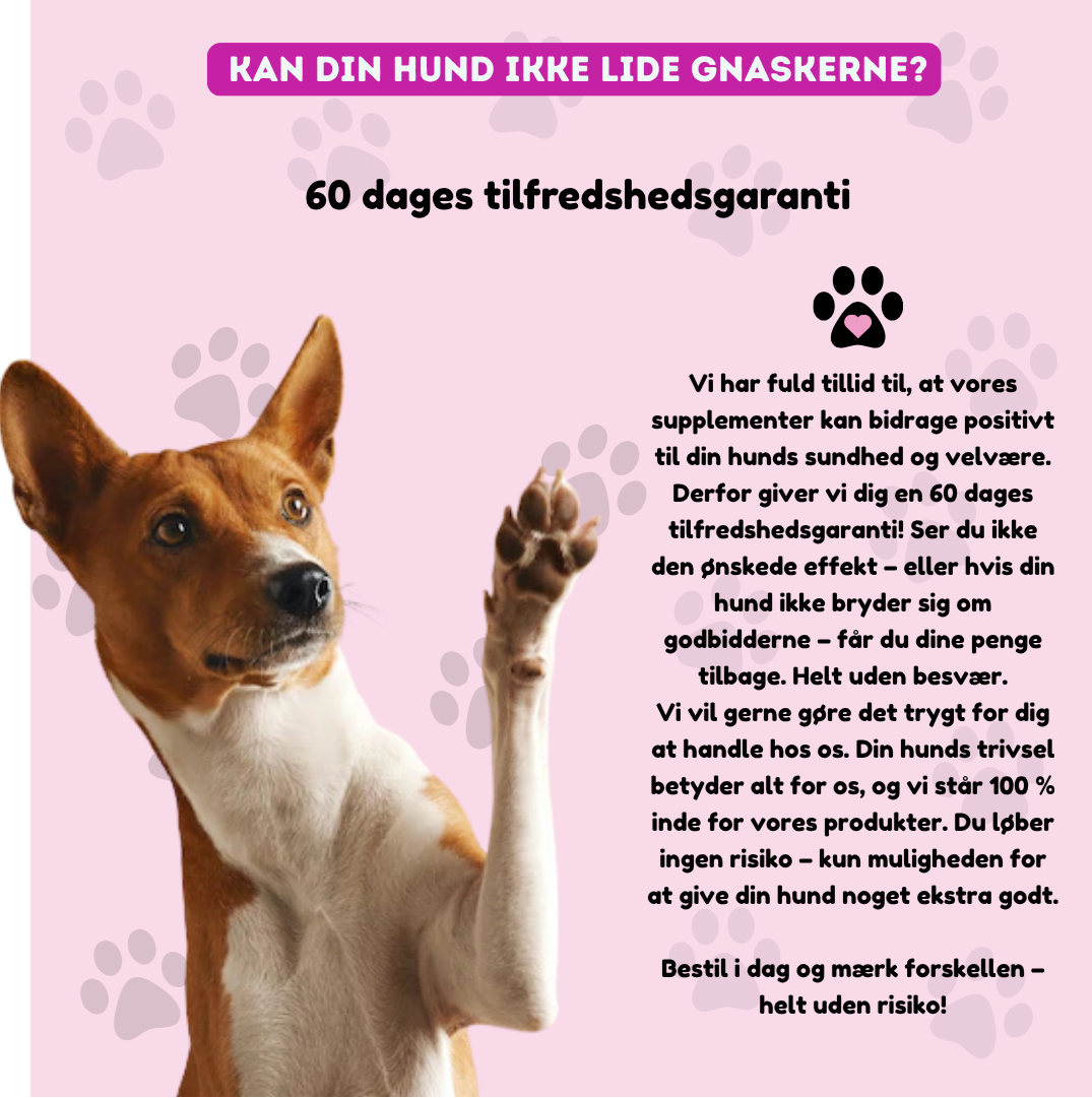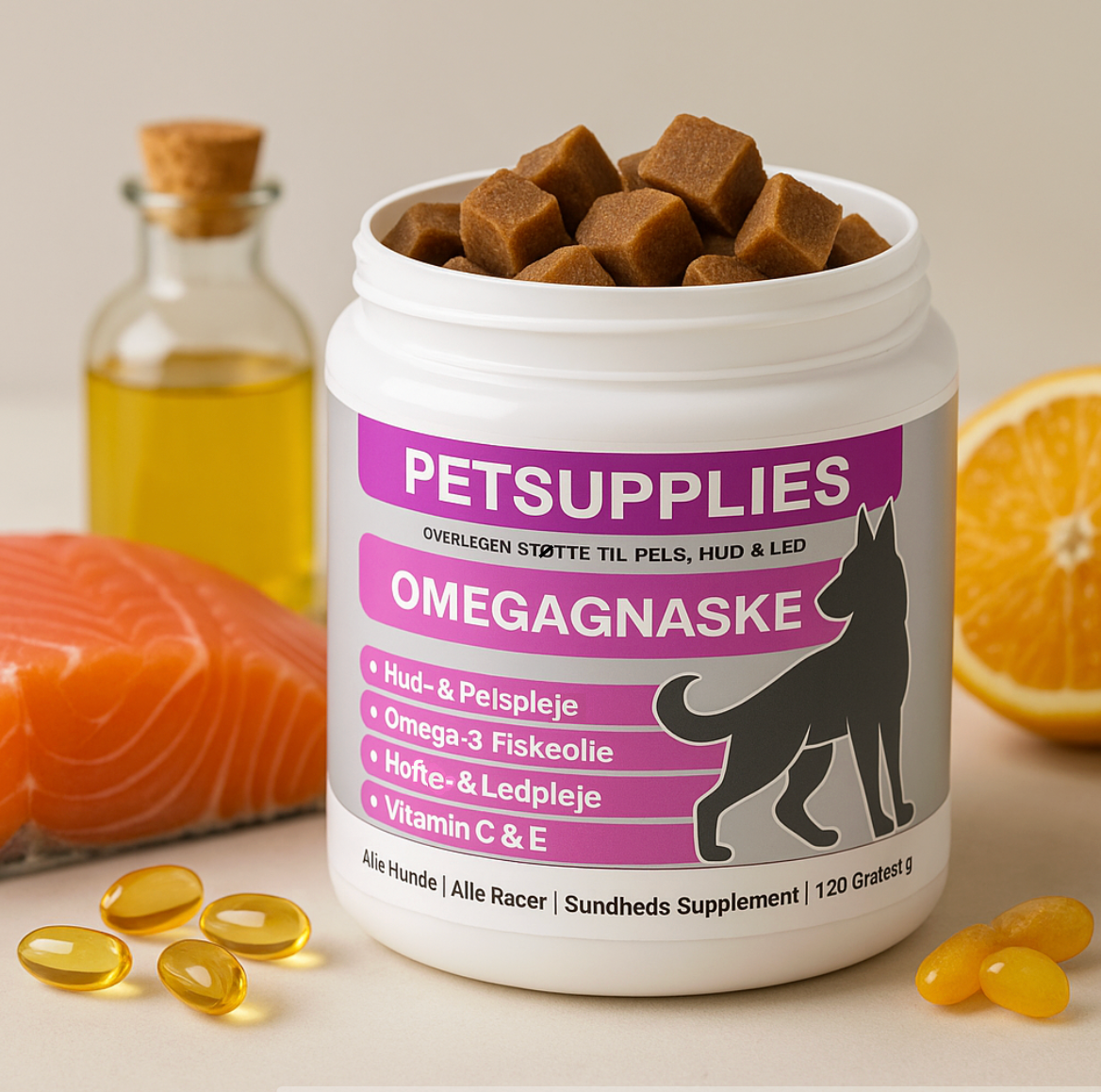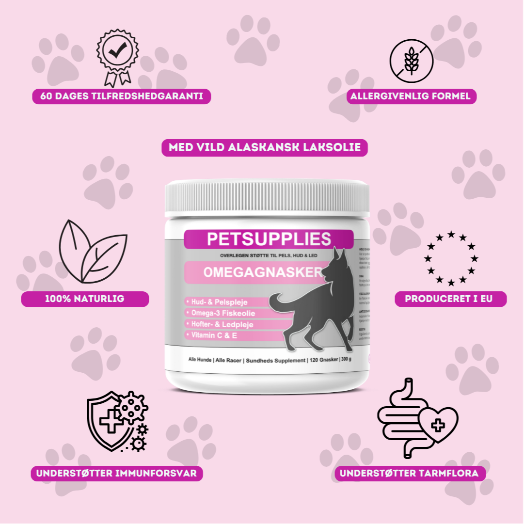 Vedligehold din hunds generelle sundhed og velvære med vores sundhedsbooster. OmegaGnaskere™, der indeholder en perfekt blanding af næringsrige ingredienser. Dette kosttilskud er designet til at støtte din hunds hud, pels og led, samtidig med at det styrker immunforsvaret og fremmer en sund livsstil.